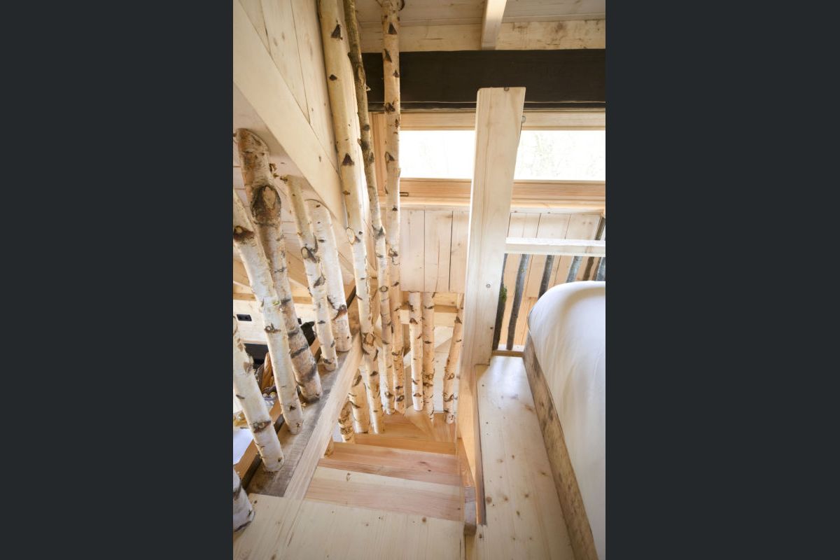 Located on the first floor, the large bathroom is separated from the living room by a curved shutter, the wooden bathtub is nestled between two gnarled trunks.