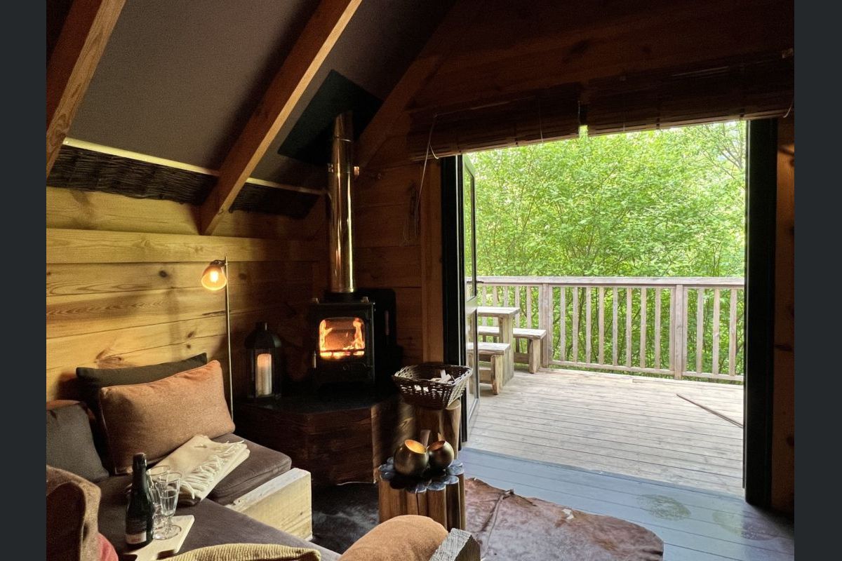 La Cabane Le Temps Retrouvé is located in the middle of the forest with a view of the Ardennes ridges. One of its particularities is the small cabin for two children which is accessible through a small tunnel. Ideal for families, the small cabin will delight children who will have a pleasant feeling of autonomy while feeling secure by the proximity of their parents. It offers an enclosed shower room dressed with cedar shingles and a small comfortable living room filled with cushions for 4 people facing the wood stove. The large double bed is nestled in a niche opening onto the fire. It will be a perfect addition to the living room during the day. If you come as a couple, the tunnel will remain closed and you will enjoy your stay as lovers.