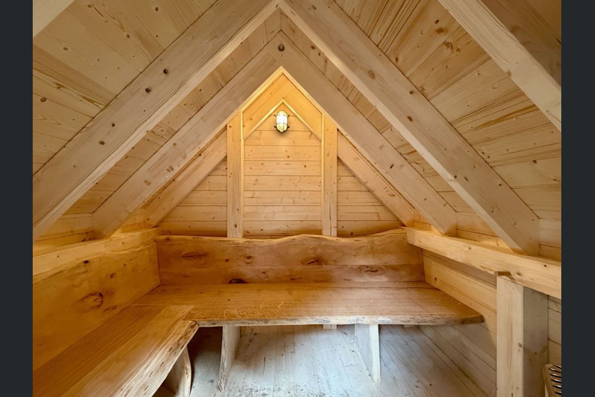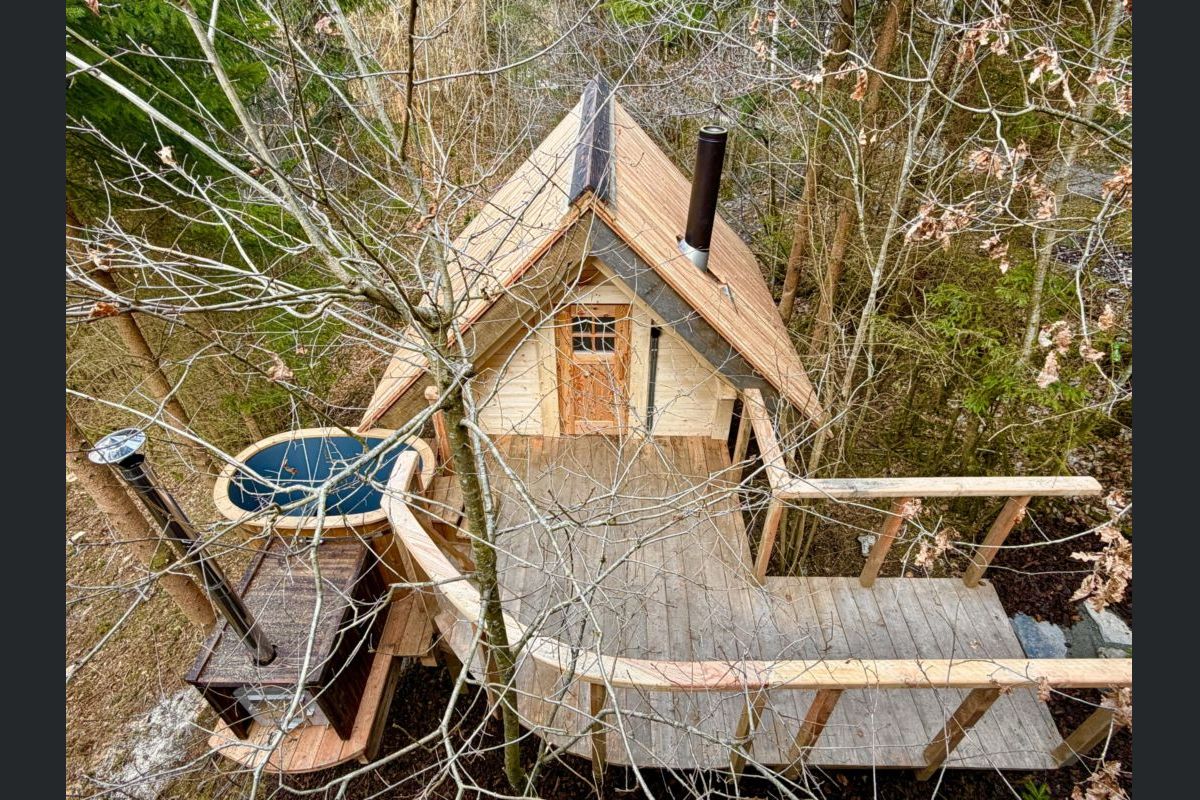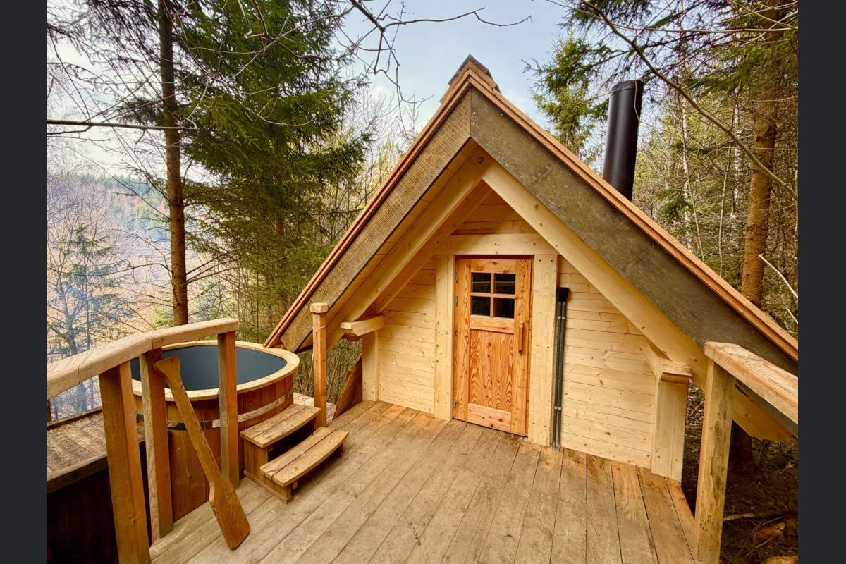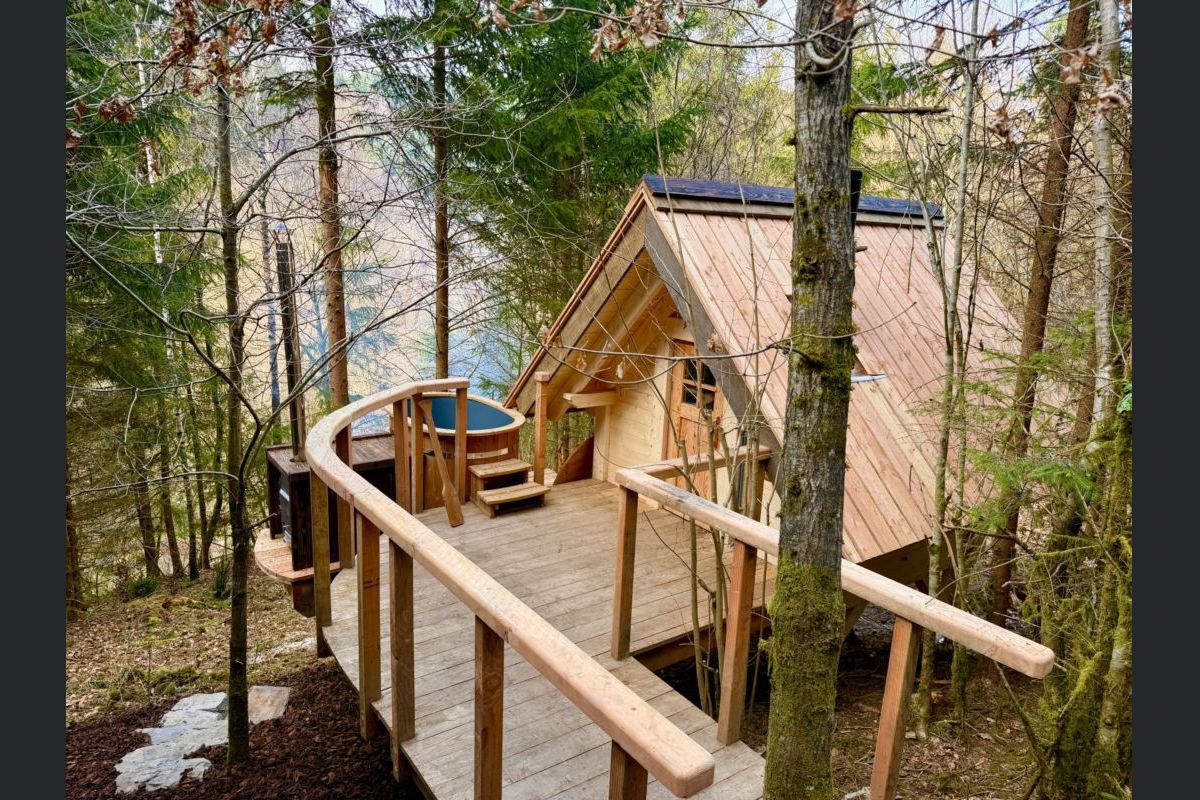 La très grande terrasse vient compléter parfaitement la cabane et donne accès à un petit sentier en contrebas qui vous emmène vers une cabane sauna et un bain nordique à chauffer au feu de bois pour des moments de bien-être en pleine nature.