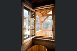Le lit niché dans une alcôve et la baignoire en bois se trouvent face au feu. Une deuxième baignoire se trouve sur la terrasse qui semble suspendue au-dessus de l’eau. La kitchenette et sa table haute vous offrent une vue imprenable sur la rivière… Une toute petite maison tout droit sortie d’un rêve !